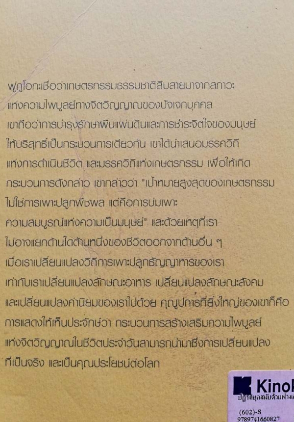หนังสือเล่มนี้ชื่อว่า “การปฏิวัติยุคสมัยด้วยฟางเส้นเดียว: ทางออกของเกษตรกรรมและอารยธรรมมนุษย์” (The One-Straw Revolution) และหนังสือเล่มนี้เองที่จะทำให้เราได้เปลี่ยนความคิดและทัศนคติของตัวเราไปและมีความเข้าใจมากยิ่งขึ้นเกี่ยยวกับ “เกษตรกรรมอย่างแท้จริง” และการอยู่ร่วมกันอย่างกลมกลืนกับธรรมชาติและสิ่งแวดล้อม หนังสือเล่มนี้ยังถือเป็นทางออกสำหรับการแก้ไขปัญหาระบบทางการเกษตรในปัจจุบันได้อย่างชัดเจนเพื่อที่จะยังสามารถทำการเกษตรได้ในอนาคตถ้าหากว่าเราจะนำแนวทางดังกล่าวมาปฏิบัติดูจริงๆ